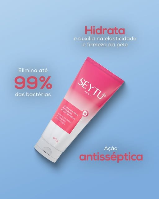 O Creme para Mãos Antisséptico Frutas Vermelhas Seytú foi desenvolvido para quem quer mãos protegidas, hidratadas e bem cuidadas ao longo do dia. Ele combina ação antisséptica com hidratação e textura leve, ajudando a manter a pele suave, macia e com toque seco, sem sensação pegajosa.